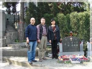 上图:赵洪啸、黄任歌、凌俐在谌老师墓前留影