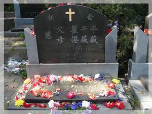 由于对扫墓路线的不熟悉,我打开车行导航仪查找石门峰公墓,没想到居然有2个石门峰公墓的地址,我挑选了比较近的一个地址驱车前往,没有想到居然开到荒郊野岭,直到没有道路了,才知道这个导航仪上标注的所谓的“石门峰公墓”整一个小荒山,不是我们要找的墓园,只好回撤,按照导航仪再直奔剩下的那个地址,应该不会再错了吧。十多公里后,看到如潮的人流、随风飘散的香火、摆满路边的纸花、鲜花和纸钱香烛,我们知道这次我们应该找对地方了。墓园的面积很大,沿路挤满了前来扫墓的人和车,我开着车子蜗牛般的前行,大约一个小时左右才找到一个可以靠边停的“车位”,于是赶紧下车寻找谌老师的墓地。由于我们都是第一次为谌老师扫墓,不知道谌老师墓地具体的位置,凌俐给谌老师小儿子小军打电话问清具体墓区后,我们很快就在茫茫碑海中找到了谌老师和丈夫瞿老师合葬的墓碑,墓碑上金灿灿的一个小十字