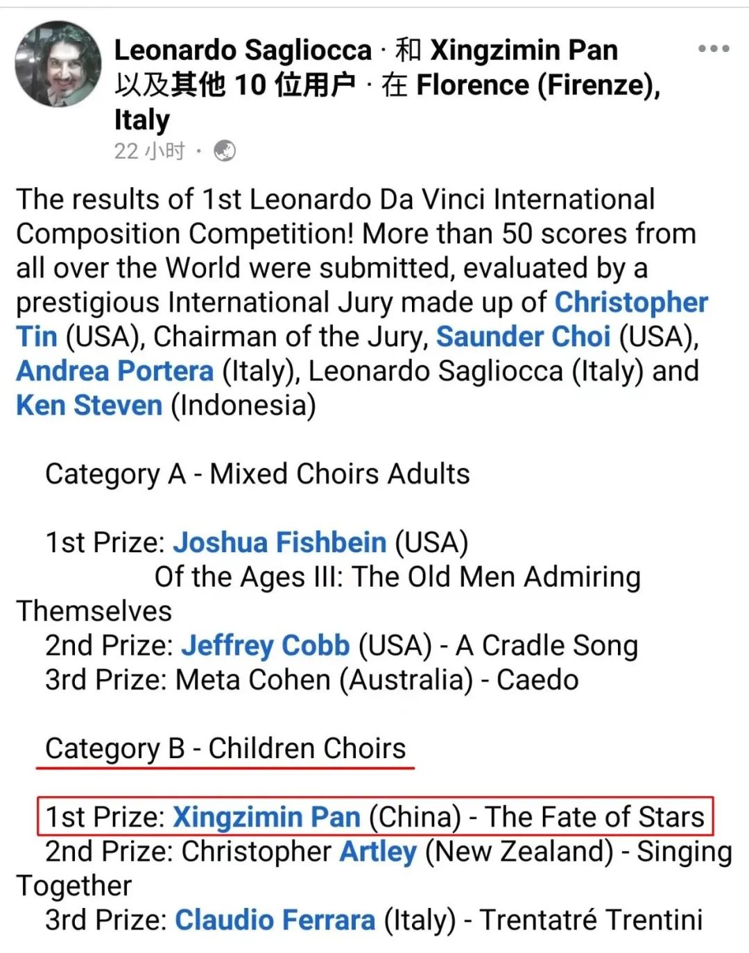 据刚刚得到的消息,潘行紫旻老师的童声合唱作品《The Fate of Stars - 星之命途》在刚结束的首届莱昂纳多·达·芬奇国际作曲比赛中,从全球50多首候选作品中脱颖而出,荣获童声合唱组别第一名!