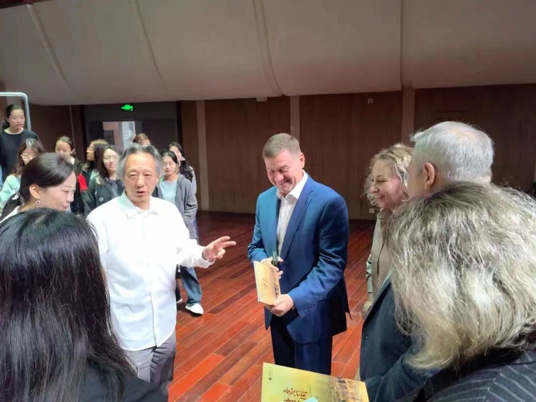 10月4日上午,代表团来我院参观交流,列莫连科校长一行参观了音乐厅,并观看了Tiankong合唱团的排练,他们对合唱团的表现给予了高度评价,认为Tiankong合唱团是世界级的合唱团,Tiankong合唱团指挥田晓宝教授为列莫连科校长一行准备了合唱团专辑作为礼物相赠。