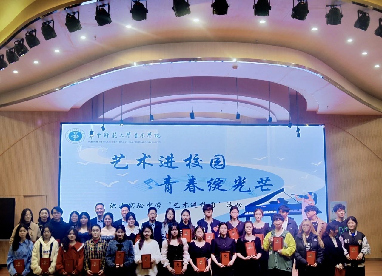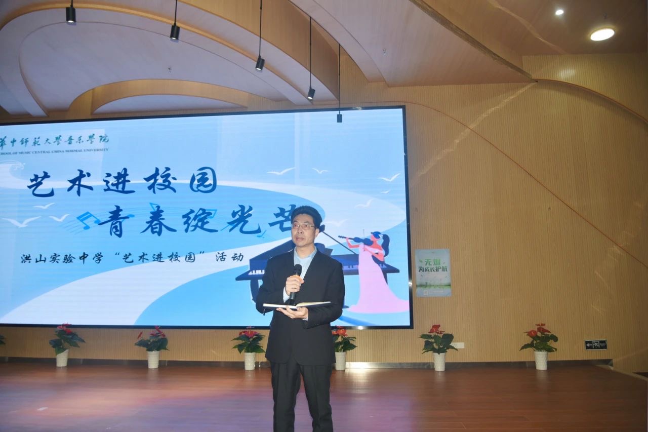 凛冬将至,华章将颂。为加强我校美育教育,提高学生艺术修养,促进学生全面发展,洪山实验中学(华师一附中东原启城分校)于11月23日下午组织开展了“艺术进校园,青春绽光芒”活动,在初冬的暖阳下,华中师范大学音乐学院与华师一附中东原启城分校的师生齐聚一堂,共同见证了一场艺术与青春的碰撞,一场激情与才华的交融。