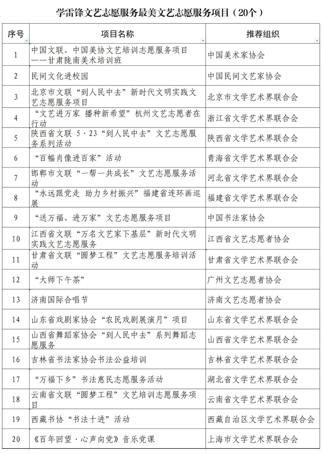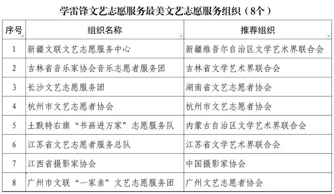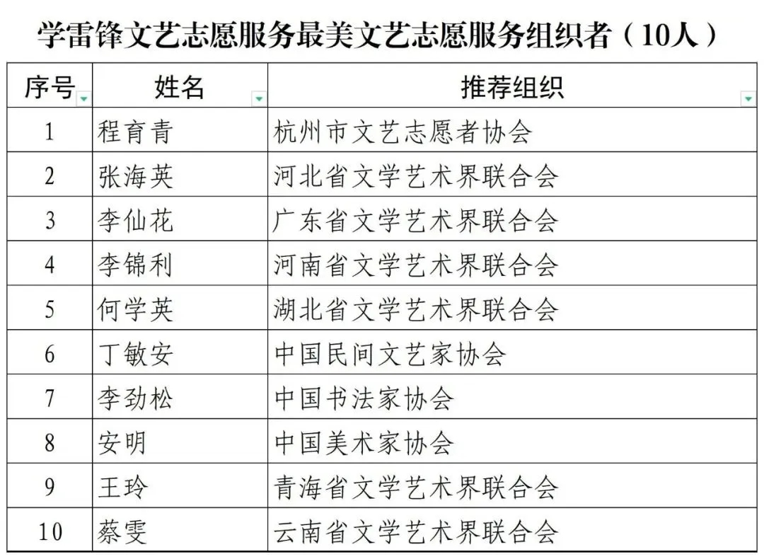 为认真学习贯彻习近平新时代中国特色社会主义思想,全面贯彻党的十九大和十九届历次全会精神,贯彻落实习近平总书记关于文艺工作的重要讲话重要论述,积极培育和大力践行社会主义核心价值观,弘扬和传承雷锋精神,倡导“奉献、友爱、互助、进步”的志愿精神,推动文艺志愿服务制度化、常态化,充分发挥文艺志愿先进典型的示范引领作用,在全社会进一步弘扬良好时代风尚,中央文明办二局(全国志愿服务工作协调小组办公室)、中国文艺志愿者协会开展了第二届宣传推选学雷锋文艺志愿服务“时代风尚”先进典型活动。现将推选结果正式公布。