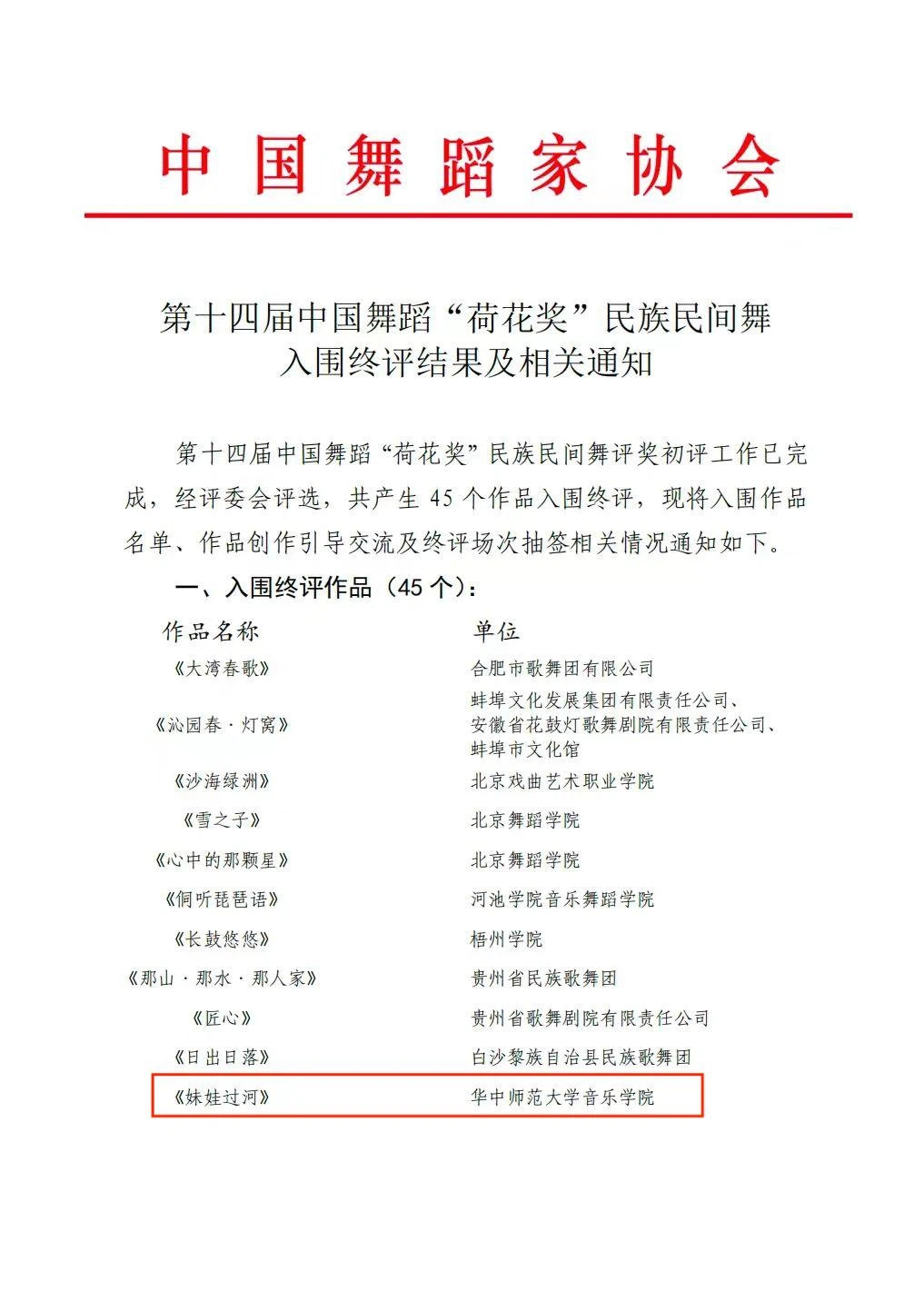 由湖北省舞蹈家协会选送的我院原创舞蹈作品《妹娃过河》入围第十四届中国舞蹈“荷花奖”民族民间舞终评。