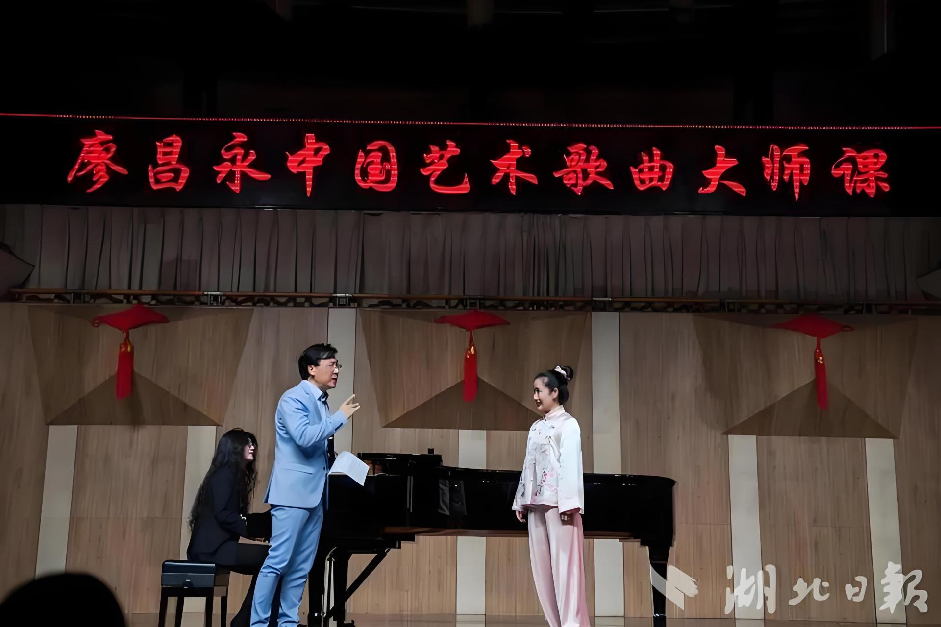 廖昌永与彭双阶、唐昌华一起为湖北省中国艺术歌曲研究与推广中心揭牌。该中心由湖北省文化和旅游厅指导,华中师范大学与上海音乐学院贺绿汀中国音乐高等研究院联合成立,廖昌永领衔,旨在依托双方在音乐教育、理论研究、艺术创作以及文化推广等方面的优势资源,实现湖北和上海两地艺术教育资源的共享与优化,推动湖北省中国艺术歌曲研究与推广,打造湖北省文化事业高质量发展的新动能。此外,廖昌永对华中师范大学音乐学院师生进行中国艺术歌曲声乐专题指导和现场教学,并联合上海音乐学院、华中师范大学音乐学院师生举行中国艺术歌曲音乐会,传递音乐艺术的无穷魅力。