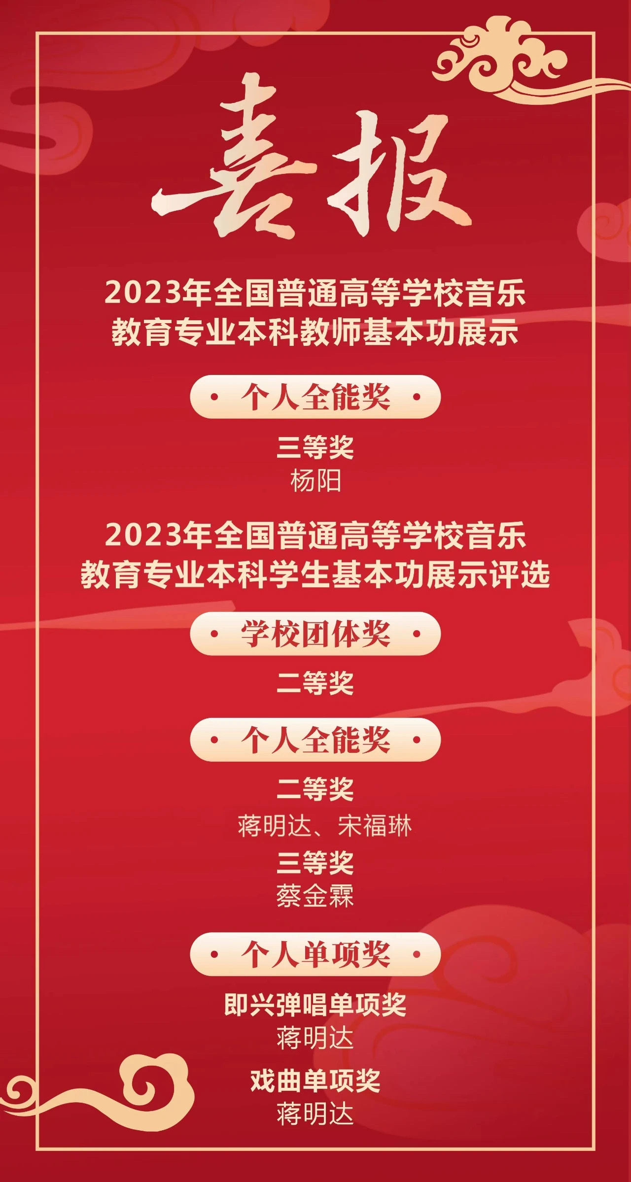 近日,教育部公布了2023年全国普通高等学校音乐教育专业本科学生和教师基本功展示评选结果:在全国107所高校的352名师生的激烈角逐中,华中师范大学喜获7个重要奖项,其中,音乐学院青年教师杨阳获教师基本功展示个人全能奖三等奖;2020级音乐教育专业本科生蒋明达、宋福琳获学生基本功展示个人全能奖二等奖;2020级音乐教育专业本科生蔡金霖获学生基本功展示个人全能奖三等奖;蒋明达获即兴弹唱单项奖、戏曲单项奖;我校参展师生勇夺学校团体奖二等奖。