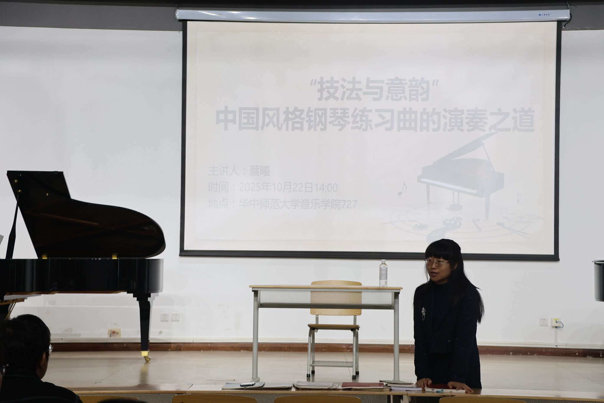 10月22日,华中师范大学音乐学院钢琴教研活动在学院727教室举办,活动特邀施坦威青年艺术家蔡曦以“技法与意韵:中国风格钢琴练习曲的演奏之道”为主题开展专题讲座,钢琴教研室主任刘珂教授主持活动。蔡曦的讲座从“写作技法、二度创造、中国韵味、演奏实践、价值意义”五个方面系统分享了中国钢琴风格练习曲的演奏与研究心得。