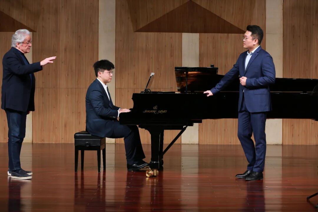 除了对歌者的指导,霍尔大师同样花了大量心血在与钢琴演奏者的配合上。他强调,歌者的肢体语言必须贴切而丰富,不仅是情感的抒发,更是向合作钢琴家传递清晰音乐意图的重要信号。一个细微的呼吸、一个预示性的眼神或手势,都能让钢琴家更精准地跟进,从而实现真正“二为一体”的默契演绎。作为享誉世界的钢琴合作大师,他亲自对合作钢琴老师进行了极为细致的指导,从宏观上把握勃拉姆斯歌曲中内敛而深情的整体风格,到微观层面手腕与手肘如何协调运力,以弹出既饱满又不失通透的音色,其耐心与精到令人叹服。