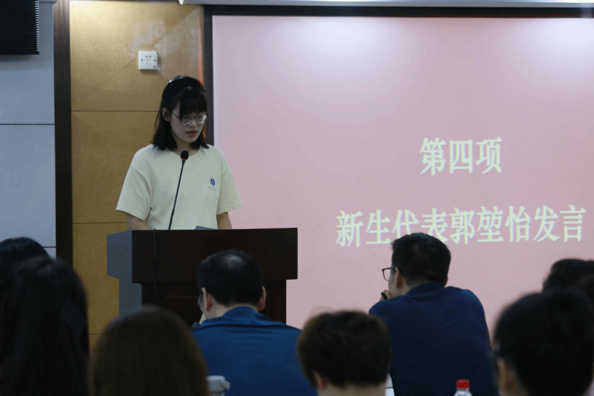 郭堃怡同学作为新生代表发言。郭堃怡在发言中表示非常有幸能够继续在音乐学习,她表示自己会树立学习目标、有意识的培养学术热情、认真学习,努力钻研,她还表示要好好利用学校的教育资源,要有目标有动力,用青春诠释誓言、放飞梦想。