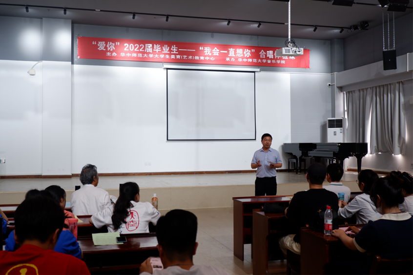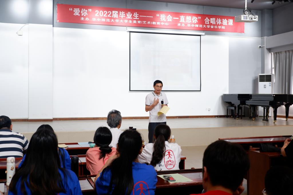 音乐学院党委副书记陈晓刚开场致辞,他表示,合唱是人声的和谐,发出的共振是心灵间的交流,非常期待本次的合唱体验课,能够给即将毕业的同学们留下悠扬的旋律,写下难忘的回忆。