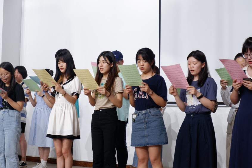 大家还共同学习了毕业歌《爱你》,研究生程哲同学非常耐心地指导体验课的同学们学习这首歌,押上旋律和拍点,大家逐渐进入到最佳状态,唱得优美又婉转,得到了田老师以及其他老师们的高度赞扬。最难忘的瞬间就是大家在投入歌唱时,田老师亲自弹钢琴为毕业生们伴奏,曾琰老师在前面担任指挥,现场其乐融融,气氛非常温暖融洽。