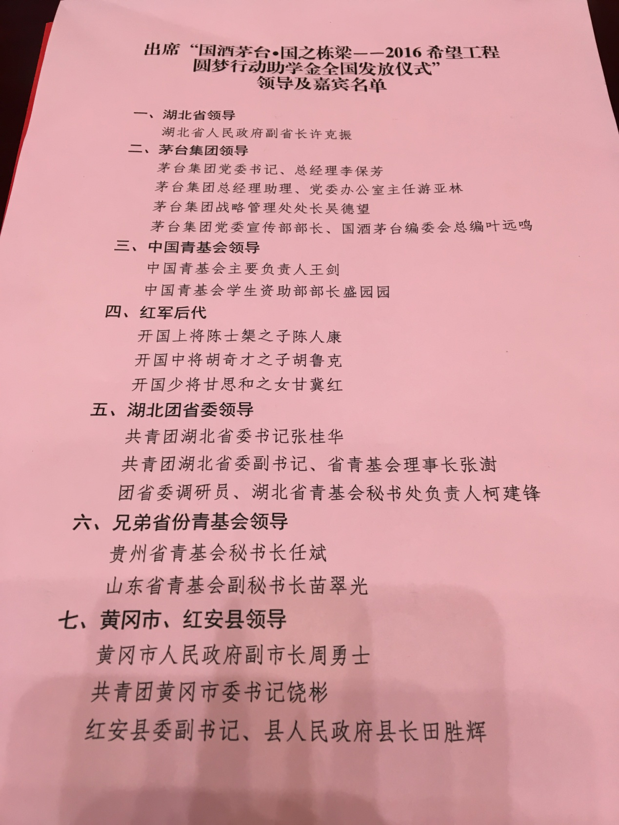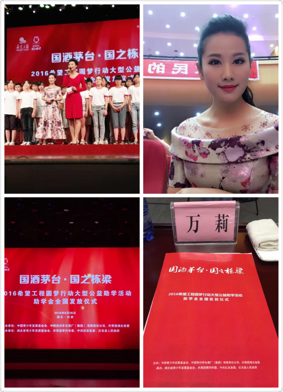 8月26日由中国青少年发展基金会、中国贵州茅台酒厂、共青团湖北省委主办的“国酒茅台、国之栋梁“2016希望工程圆梦行动大型公益助学活动在红色土地红安举行。出席此次活动的有湖北省人民政府副省长许克振、茅台集团党委书记、总经理李保芳、中国青基会主要负责人王剑等领导及嘉宾。万莉老师演唱主题曲《我们的未来》。她说,希望受到资助的这些幸运的寒门学子能够怀揣感恩之心继续努力,报效祖国和社会。