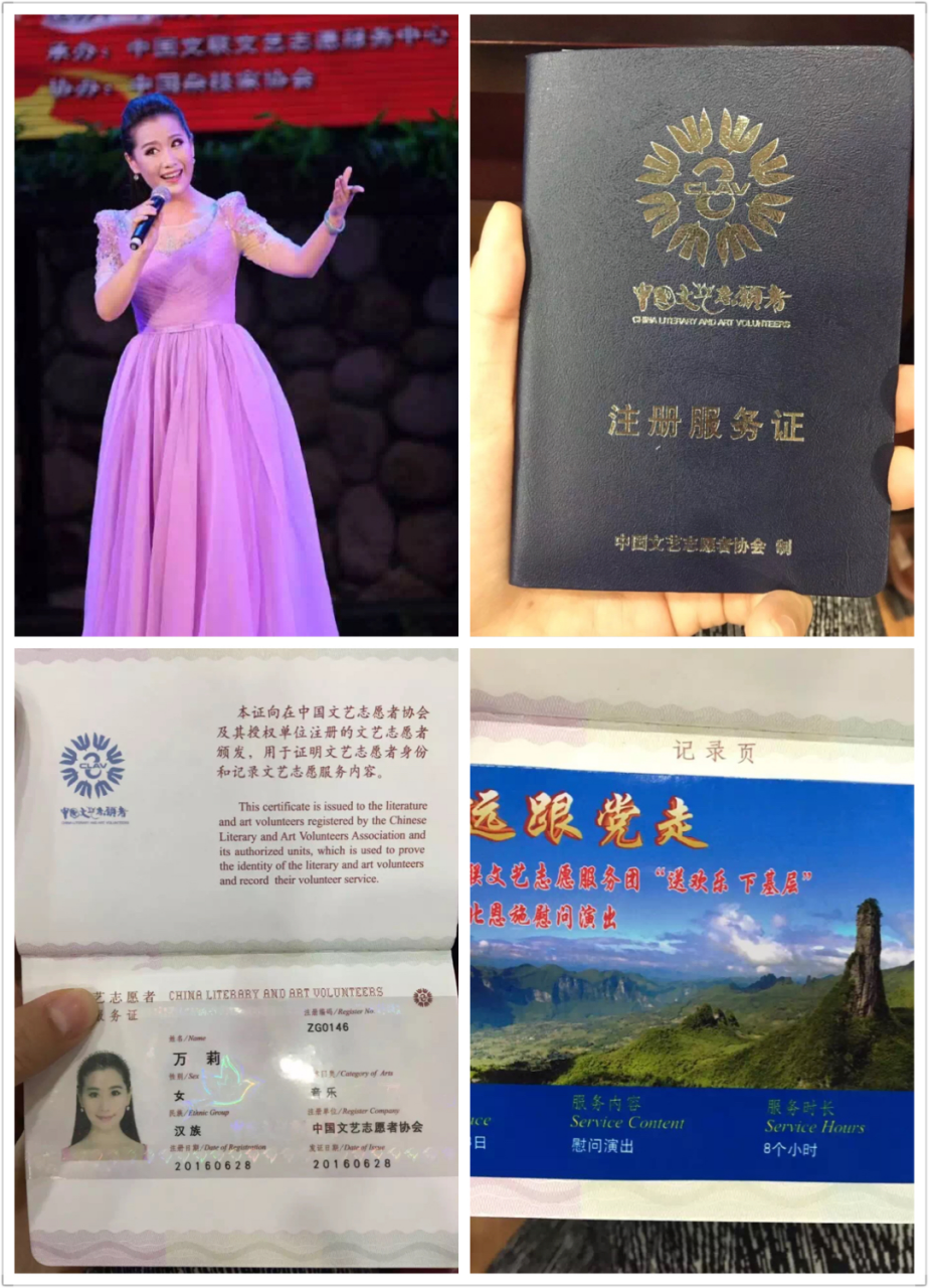 6月28日,万莉老师得到一个有着特殊意义的服务证:中国文艺志愿者注册服务证,这个证和护照一样,每次去一个地方慰问都会贴上一个象征意义的标签。万莉老师很希望能够通过这样的一本服务证踏遍更多的基层慰问点,做到能够真正的到人民中去,为人民歌唱。同日万莉老师参加了由中国文学艺术界联合会、中共湖北省委宣传部、中国文艺志愿者协会联合主办的《永跟党走》中国文联文艺志愿服务团“送欢乐,下基层”走进湖北恩施慰问演出,万莉老师演唱了《龙船调》和《党旗更鲜艳》。她说,这是她为服务证贴上的第一个标签,她很感谢能够实现自己一直以来的心愿—为人民歌唱,感慨可以在这次活动中认识很多艺术家前辈并向他们学习。