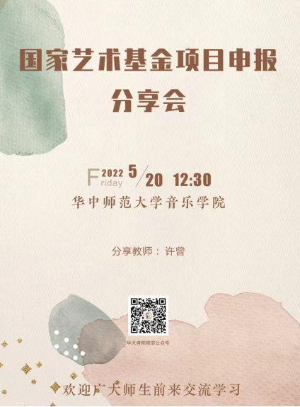 5月20日中午12时,音乐沙龙“国家艺术基金项目申报分享会”(第九期系列讲座)于华中师范大学音乐学院317教室成功举办。作曲指挥系青年教师许曾进行了国家艺术基金项目申报相关内容的分享。参加此次讲座的有我院青年教师,以及部分研究生、本科生同学们。