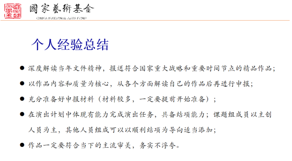 讲座第一阶段首先由许曾老师进行了国家艺术基金2023年度资助项目申报指南的解读。她提到:“国家艺术基金是是经国务院批准设立的旨在繁荣艺术创作、打造和推广精品力作、培养艺术人才、推进国家艺术事业健康发展的公益性基金,为文化艺术事业繁荣发展做出了积极贡献。从2014年至今,每一年的国家艺术基金资助项目申报指南都会在当年项目申报前发布,在国家艺术基金的官网上就能查阅到。认真的解读申报指南是成功申报国家艺术基金最重要的第一步。在今年发布的2023年度资助项目申报指南中,明确指出新时代新征程是当代中国文艺的历史方位,要深刻把握民族复兴的时代主题,围绕举旗帜、聚民心、育新人、兴文化、展形象的使命任务,以实现高质量发展为目标,繁荣艺术创作,聚焦精品力作,培育德艺双馨的高水平艺术人才,促进满足人民文化需求和增强人民精神力量相统一,服务社会主义文化强国建设。重点资助立足新时代新征程,抒写中国人民奋斗之志、创造之力、发展之果,用心用情用功展示新时代新征程恢弘气象的重大现实题材作品;秉承正确的历史观,反映党史、新中国史、改革开放史、社会主义发展史,反映党团结带领人民在奋斗过程中涌现的光辉事迹、先进人物、重大成就和伟大精神的重大革命题材作品创作;深入挖掘中华优秀传统文化的思想观念、人文精神、道德规范,把艺术创造力和中华文化价值融合起来,赋予其时代内涵和价值的重大历史题材和传承弘扬中华优秀传统文化题材作品创作。”