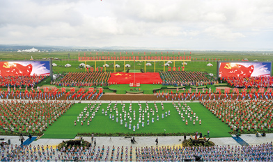 1.2万多名身着盛装的各族各界干部群众,从四面八方欢聚在文化体育运动中心,共同庆祝盛大的节日。开阔的会场内,“建设亮丽内蒙古 共圆伟大中国梦”的主题标语格外醒目;蒙汉两种文字书写的“紧密团结在以习近平同志为核心的党中央周围 以优异成绩迎接党的十九大胜利召开”横幅高悬,整个会场座无虚席。