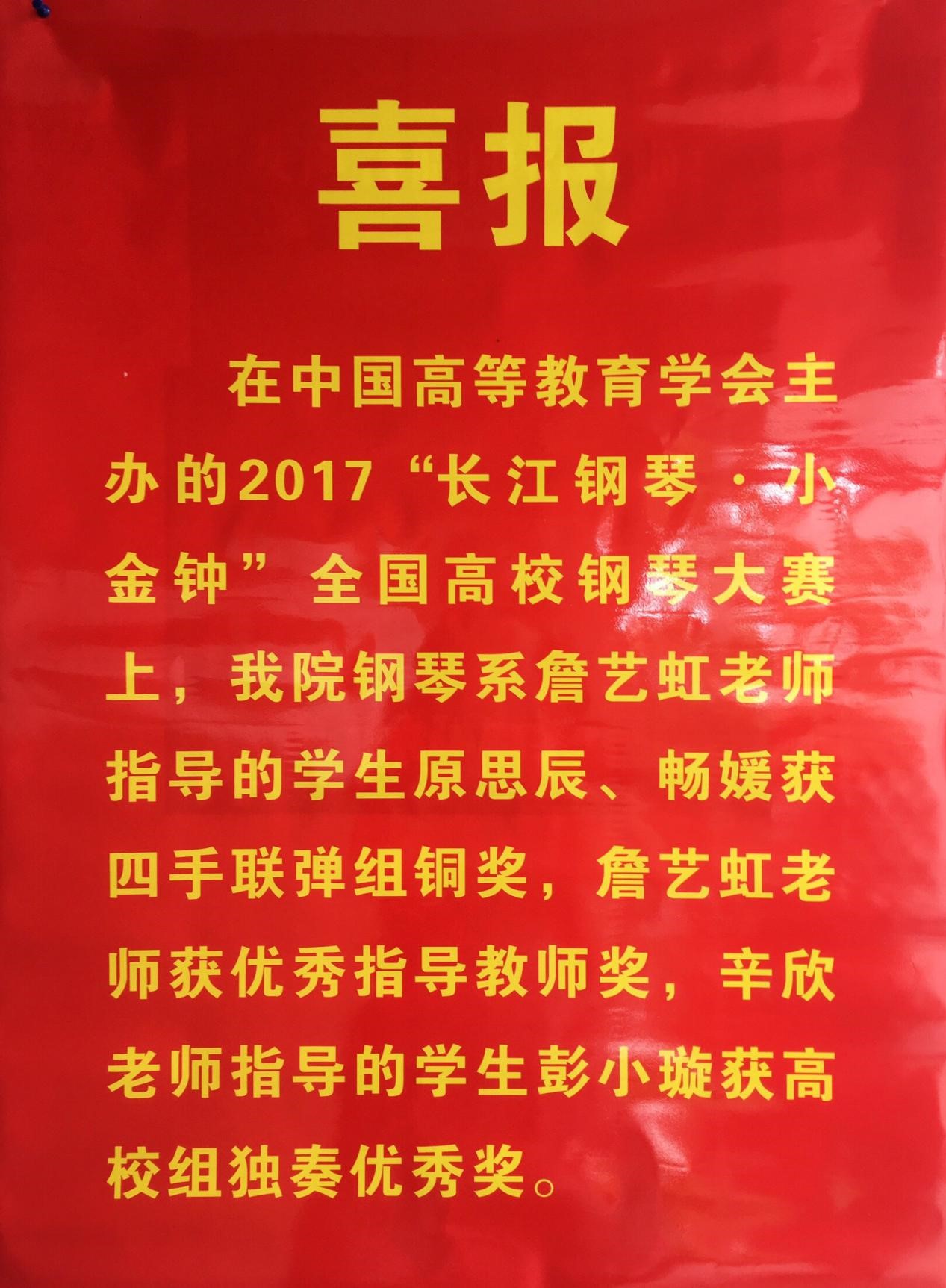 原思辰、畅媛赛后对此次比赛进行了总结,她们认为:首先,要感谢我们的导师詹艺虹教授对我们的辛勤指导。我们认为四手联弹作为钢琴演奏中的一种形式,能够极大发挥钢琴的表现力,同时也是对两位钢琴演奏者能力和默契的考验。经过此次比赛,我们不仅提高了两人协作的能力,还对四手联弹这种形式有了更深刻的理解和认识,明白了如何在一首曲子里进行分工和配合。通过四手联弹这种形式的演奏,丰富了钢琴的音响效果,对于我们未来进行独奏也有很好的帮助。另外,在这次比赛里,我们也观摩了其他组的演奏并进行了交流。通过交流和学习,发现了还有很大的提升空间,在今后的日子里,我们会继续努力,再接再厉!同时,也祝贺我院辛欣教授指导的学生彭小璇获得高校独奏组优秀奖!