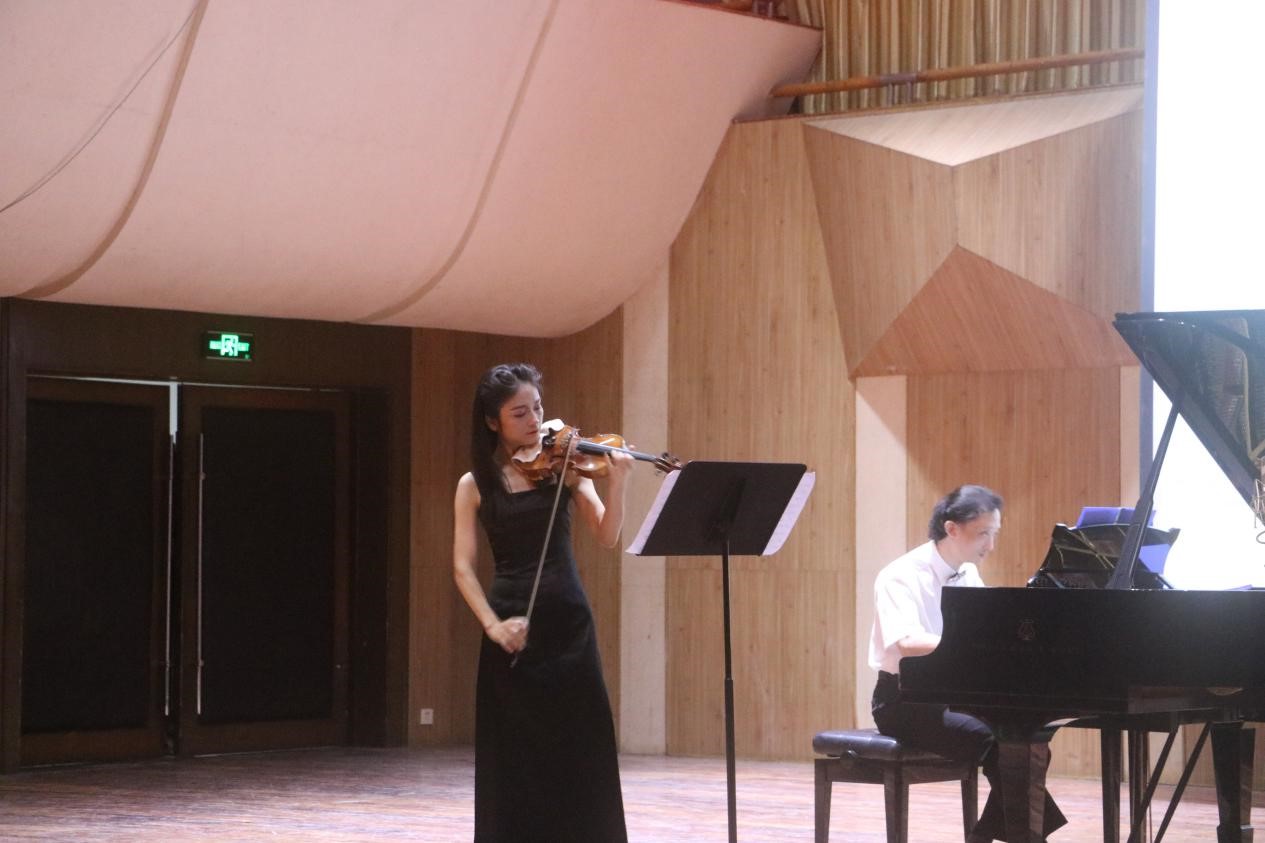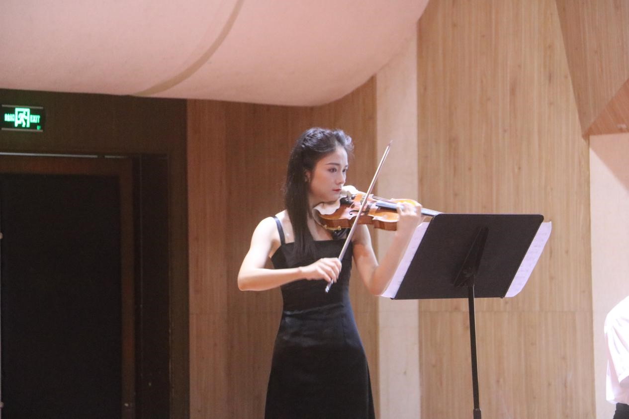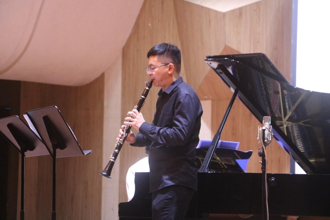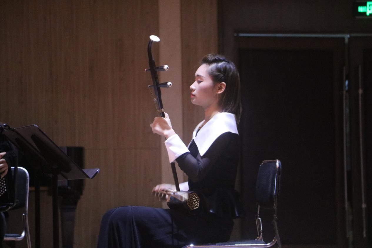 上半场每一首曲子都是由武汉音乐学院副教授冷岑松作曲,展现了冷老师深厚的作曲实力于独到的音乐理解。第一首是钢琴和长笛共同演奏的《无尽之源》。在整首曲子中,钢琴就如画布上的底色,而悠扬的长笛就如一支画笔,绘出了永无边缘的辽远与广阔。随后钢琴、手风琴和二胡共同演奏的《帕萨卡利亚(轮舞)》将整场气氛推至高潮。这是一首节奏性很强的曲目,舞曲的风格给人眼前一亮,最爱二胡与手风琴的相互点缀,使整首曲子的风格明朗活泼。第三首钢琴与单簧管共同演绎的《苗族风格的爵士》。这完全不同于平日里的苗族歌曲,爵士元素的融入使整首曲子变得神秘,令人捉摸不透。随后是钢琴与小提琴共同演绎的《西域畅想》。整首曲子偏异域风格,小提琴虽然声音悠长又清亮,但却演奏出一种大西北的豪迈之风,“大漠孤烟直,长河落日圆。”,在枯黄色的荒漠中,一人一马,自在独行。上半场音乐会的最后一首演奏曲目是双钢琴共同演奏的《龙船调》。通过冷岑松副教授的改编,《龙船调》早已不再是一首民歌小调,而是一首给以人震撼之感的宏大曲子。在主旋律处,两台钢琴所共同发出的声音响彻整个音乐厅,也惊异了每一个人。