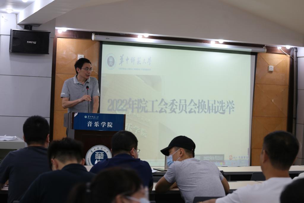 2022年9月23日下午14:00,华中师范大学音乐学院召开2022年院工会委员会换届选举。今天大会应到工会会员77人,据统计,因公、因病、因事请假3人,实际到会的工会会员74人,超过应到工会会员的三分之二,符合法定人数。会议由音乐学院党委书记冯圣兵代院工会主席闫大卫主持。