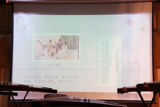 高雁教授通过我国音乐文化最早产生的文物实证“贾湖骨笛”来引入传统乐器的八音:金、石、土、革、丝、木、匏、竹。其中古筝属于“丝”,所谓江南丝竹乐器之一。“高山流水遇知音”,早在春秋战国时期,古筝便盛行于当时的秦地,《史记·李斯列传》记载:“夫击瓮叩缶,弹筝搏髀,而歌呼呜呜快耳﹝目﹞者,真秦之声也。”在了解了古筝的古老起源之后,高雁教授带着我们从各个朝代古筝弦数的演变与文人墨客用诗词表达对古筝的喜爱来感受它源远流长的历史与散发出的独特魅力。