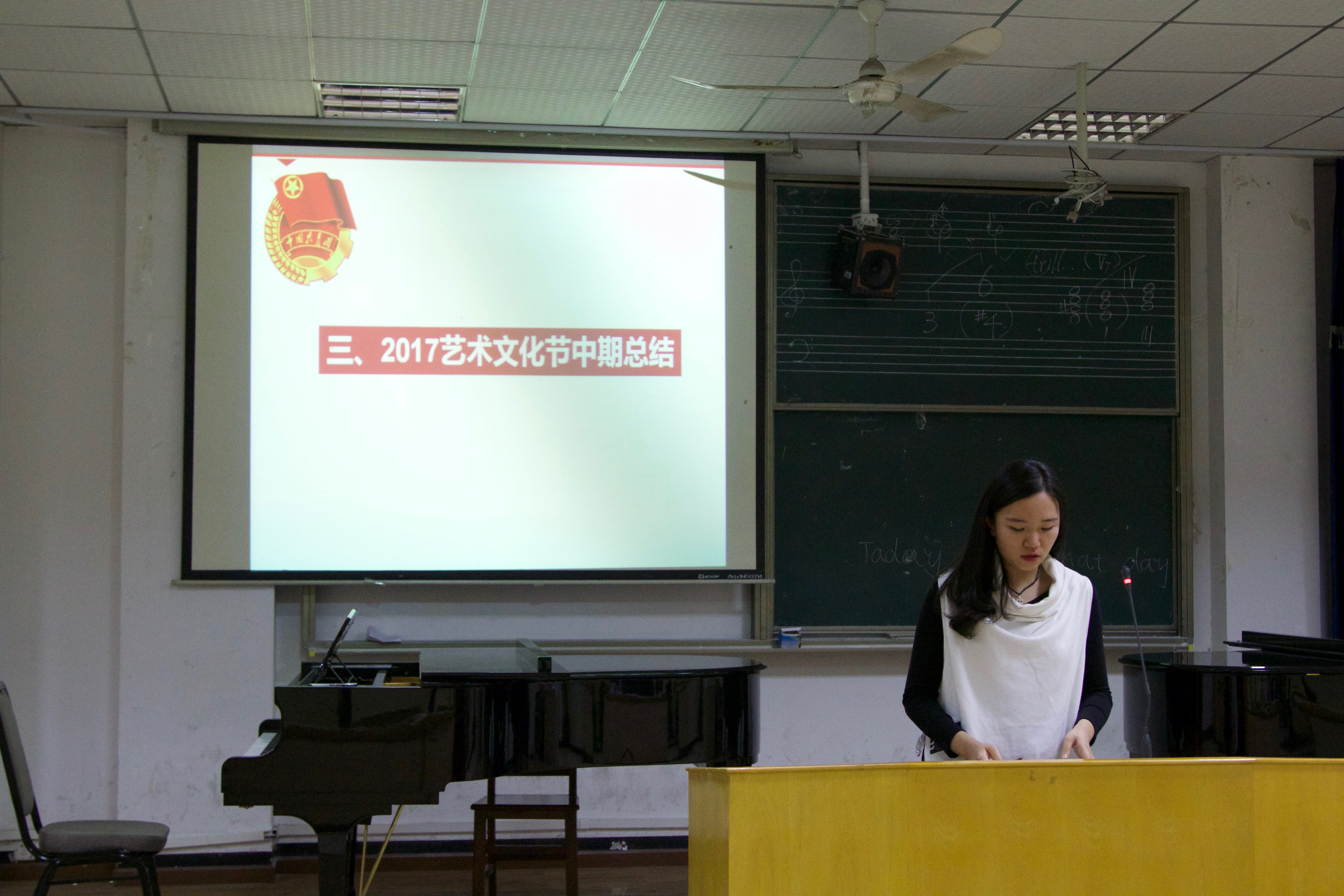 大会第二项,针对2017年艺术文化节进行中期汇报。学生会副主席田晓雨和付钰分别对2017年艺术文化节的开展进行了中期汇报。两人指出,我院前期在“Spring音乐节”,“厨艺大赛”等项目上均取得了良好的效果。正在开展的两大重点项目,即将百生讲坛和“Tiankong”杯合唱比赛的服务项目。