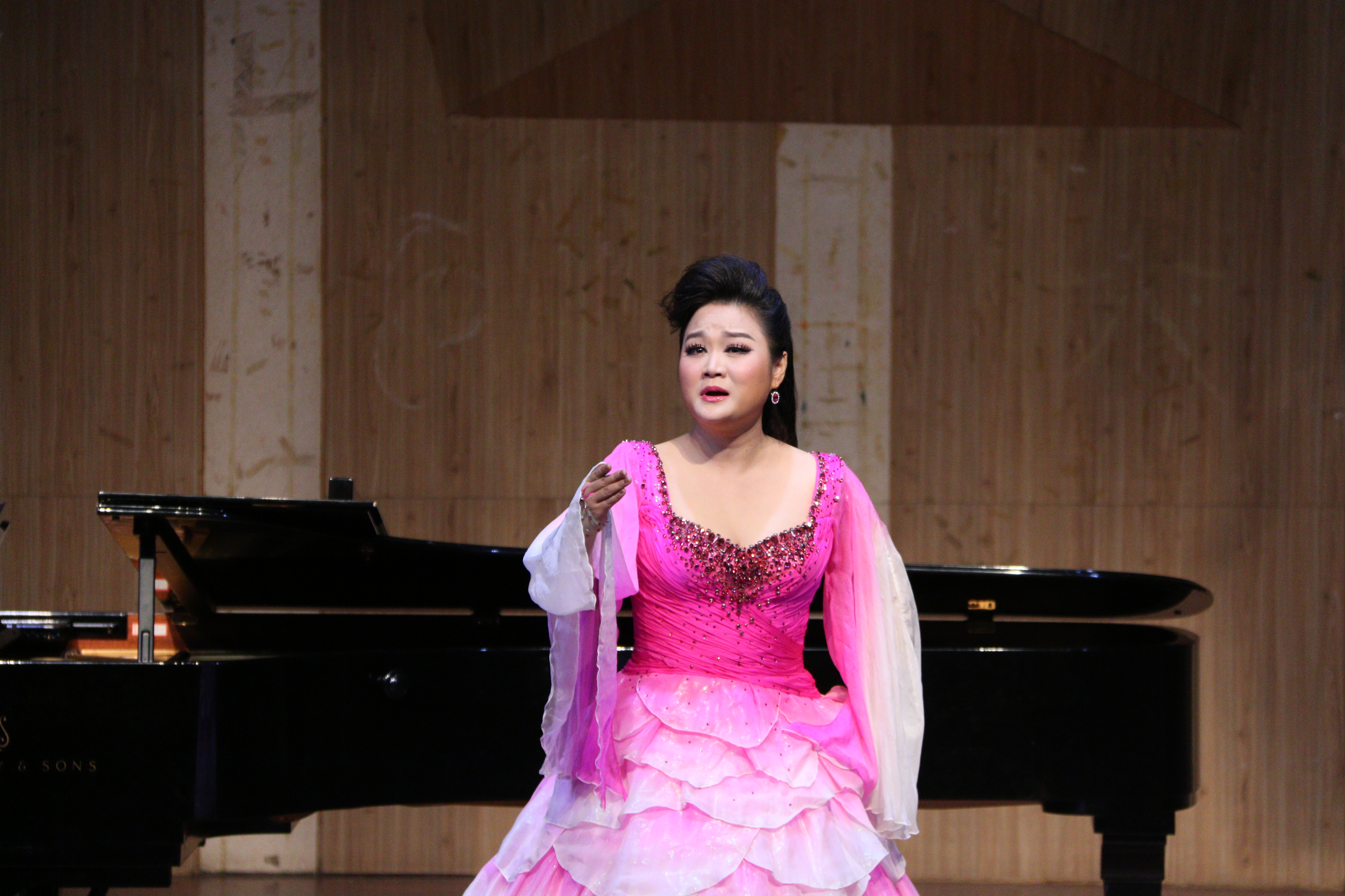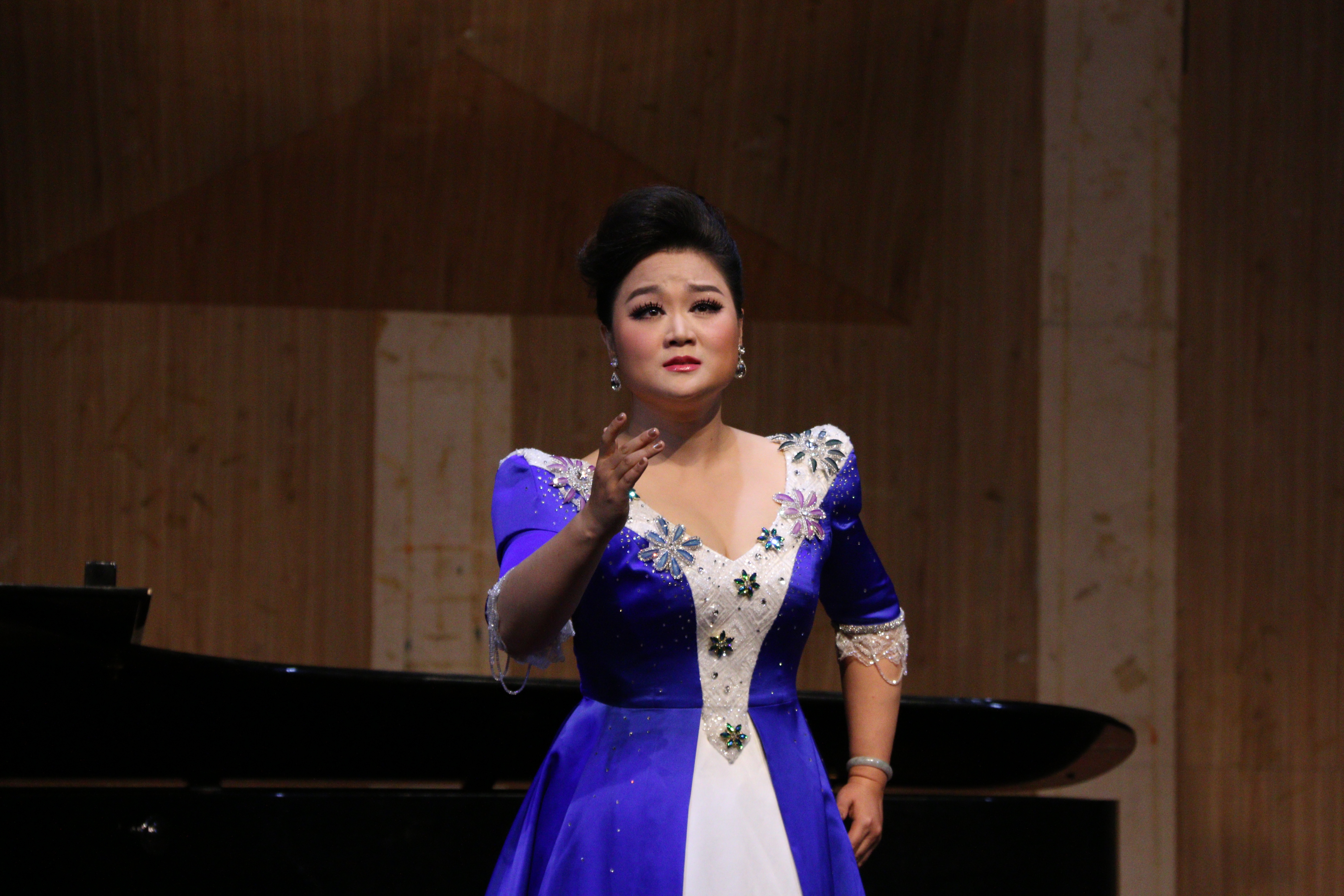 随后,袁渊以一首古曲《越人歌》点燃了音乐的的气氛。《越人歌》和楚国的其他民间诗歌共同开启《楚辞》的艺术源头,是中国最早的翻译作品, 也是古代楚越文化交融的结晶和见证。在悠扬婉转的歌声中她婉婉道出了古时人们对跨越阶级的爱情的向往。随后袁渊相继为我们带了《七步诗》、《知己红颜》、《鸟儿在风中歌唱》、《不能尽孝愧对娘》等一系列艺术歌曲。其中袁渊演唱的《鸟儿在风中歌唱》是一首广受演唱的花腔女高音艺术歌曲,歌曲内容贴近生活,体现出的是一种人与大自然要“和谐共处”的时代精神。这首作品是很多歌唱家音乐会的首选,也是歌唱比赛中检验演唱能力的试金石。而袁渊就像一只婉转的鸟儿,用自己美妙的声音唱出了鸟儿在风中强烈的情感,它的呐喊它的愤慨和它的无助,声音时而高昂时而低沉,她将这首演绎得入木三分,现场观众无不沉浸在她的声音里,将本场音乐会直接推上了高潮。