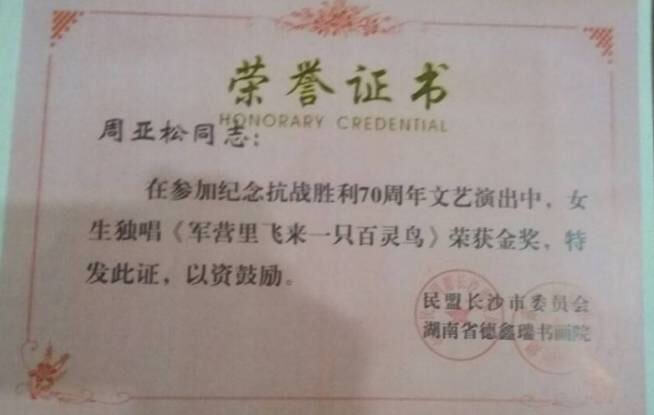 2015年首届湘商之声全球总决赛最佳风尚奖声乐独唱金奖:周亚松