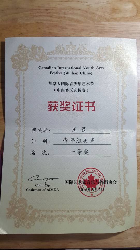 加拿大国际青少年艺术节中南赛区选拔赛青年组美声一等奖:王蓉