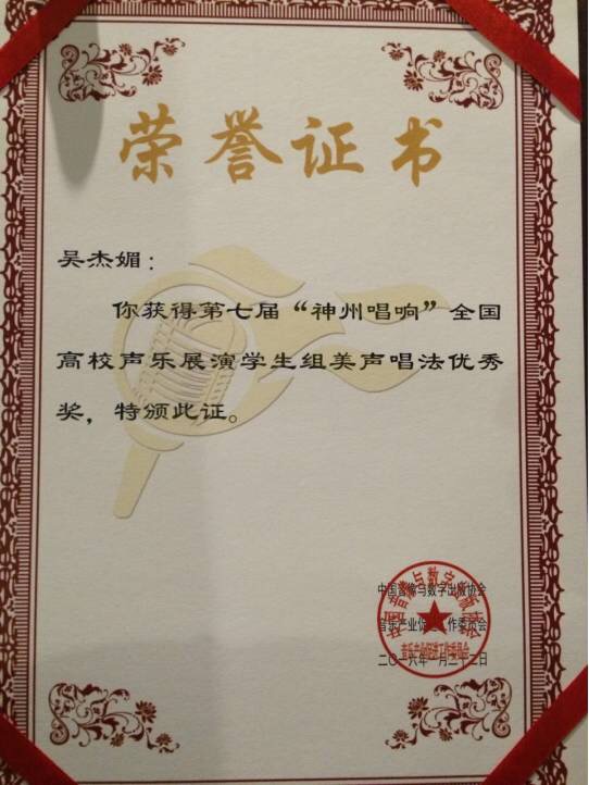 第七届“神州唱响”声乐展演组美声唱法优秀奖:吴杰媚 黄柠柠