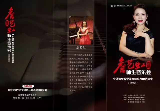 2018年4月15日~16日,华中师范大学音乐学院詹艺虹教授师生一行在湖南理工学院音乐学院成功举办师生音乐会和专题讲座。15日7:30,詹艺虹教授师生音乐会在湖南理工学院音乐厅举行。湖南理工学院音乐学院院长陈文红、研究生院副院长黎振强以及钢琴教研室全体老师出席。