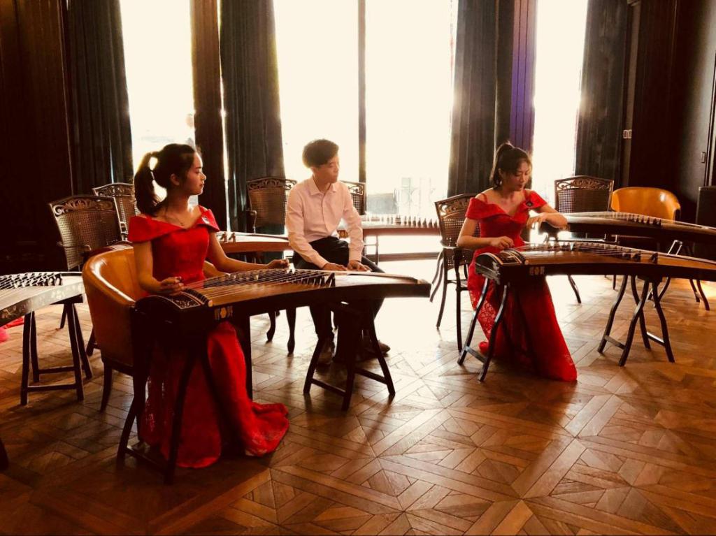 在领导发言后,民乐团带来了《沙漠玫瑰》,古筝五重奏曲将一位赤足的红衣姑娘在沙漠中热烈舞蹈的场景表现的淋漓尽致,不难看出我国传统音乐的博大精深与地域风情的无限魅力,华中师范大学音乐学院学子用完美的表演为本次音乐节拉开了序幕。