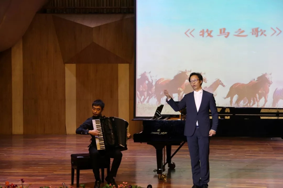 陈岭老师的《牧马之歌》也让人印象深刻,这首由手风琴伴奏的《牧马之歌》是一首具有哈萨克族风味的歌曲,由陈岭老师以热烈、豪放的情绪表达出来,演唱中还不时与台下观众互动,一下子将音乐会的气氛推至高潮。