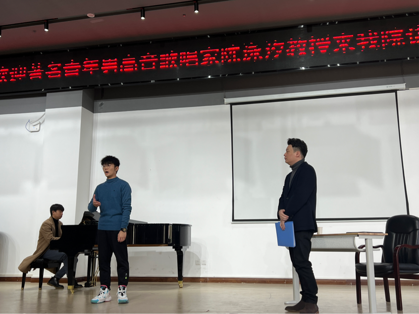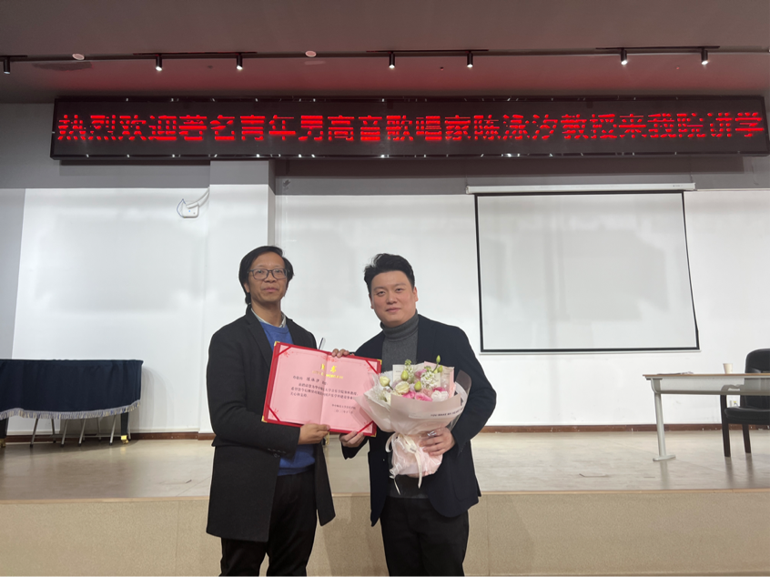 在讲座中,陈泳汐教授分享了他过去学习声乐的一些经历,并对三位学生的演唱进行了耐心和细致的点拨,现场师生受益匪浅。讲座结束后,我院声乐系主任陈岭教授,对陈泳汐教授的到来表示衷心的欢迎和感谢,并代表为陈泳汐教授颁发学院客座教授聘书。