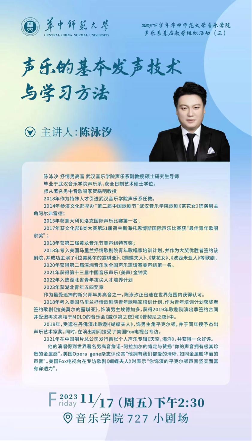 2023年11月17日下午2点30分,武汉音乐学院青年男高音歌唱家陈泳汐教授在华中师范大学音乐学院727小剧场开办了《声乐的基本发声技术与学习方法》的讲座,晚上7点30分在音乐厅举办了陈泳汐师生音乐会。