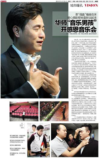 其中,《楚天金报》5月25日头版图文报道,第5版整版报道,题为《患“强直”瘫痪在床爱心捐助帮他重新站起来 华师“音乐男孩”开感恩音乐会》。报道转载如下: