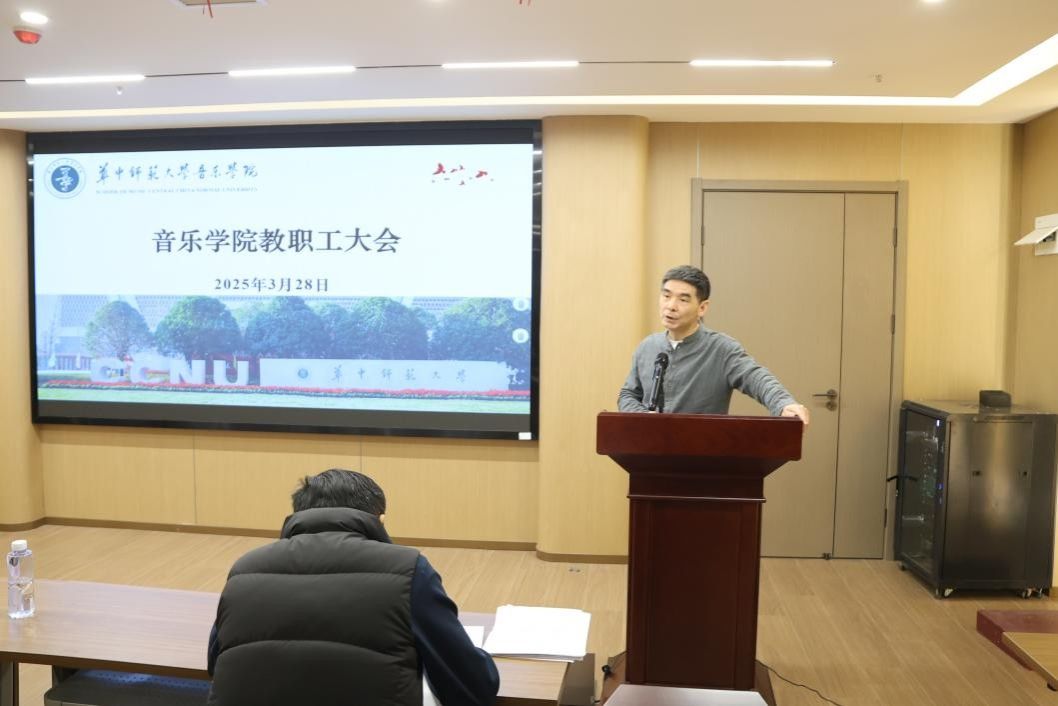 2025年3月28日下午,音乐学院在1号报告厅召开教职工大会,全体教职工参会。会议由学院党委书记梁伟主持,围绕领导班子述职述廉、评价制度改革文件解读及近期重点工作部署展开。