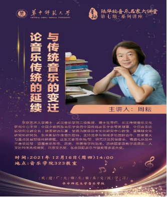 2021年12月16日(周四)14时,由华中师范大学音乐学院主办的《论音乐传统的延续与传统音乐的变迁》讲座在音乐学院323教室顺利举行。武汉音乐学院教授周耘受邀主讲,华中师范大学音乐学院副院长詹艺虹教授主持。音乐学院张业茂副院长、陈永教授及音乐学系、声乐系、器乐系部分教师及校内外学生到场聆听学习。周教授部分讲座通过录音录像等多媒体影音资料,梳理分析,旨在阐释音乐传统的强大生命力,从而化解对传统音乐变迁的过分忧虑。
