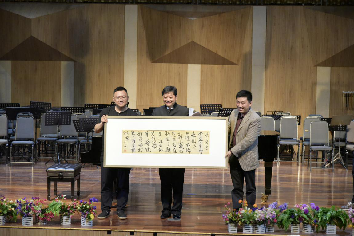 开场过后,孙永祥书记和王建书记分别作为华中师范大学音乐学院与中国人民大学艺术学院的代表互赠礼物。楚文化的标志——虎座凤架鼓和人大教授亲笔书法作品,艺术与审美价值并存,表达了对两校长久友谊的见证以及未来的祝愿。