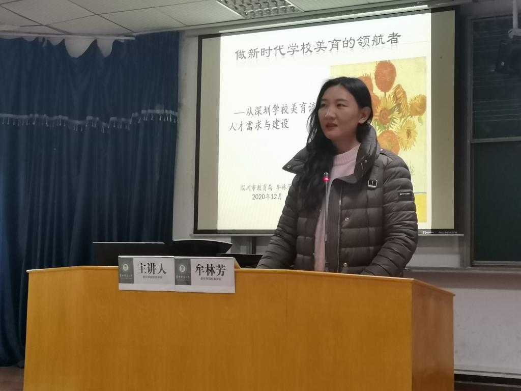 牟林芳结合自己18年的学校美育工作实践与体会,做了题为《做新时代学校美育的领航者——从深圳学校美育谈人才需求与建设》的报告。她从新时代学校美育的发展背景、深圳学校美育高质量发展、新时代学校美育的人才需求与建设三个方面做了全面阐述。