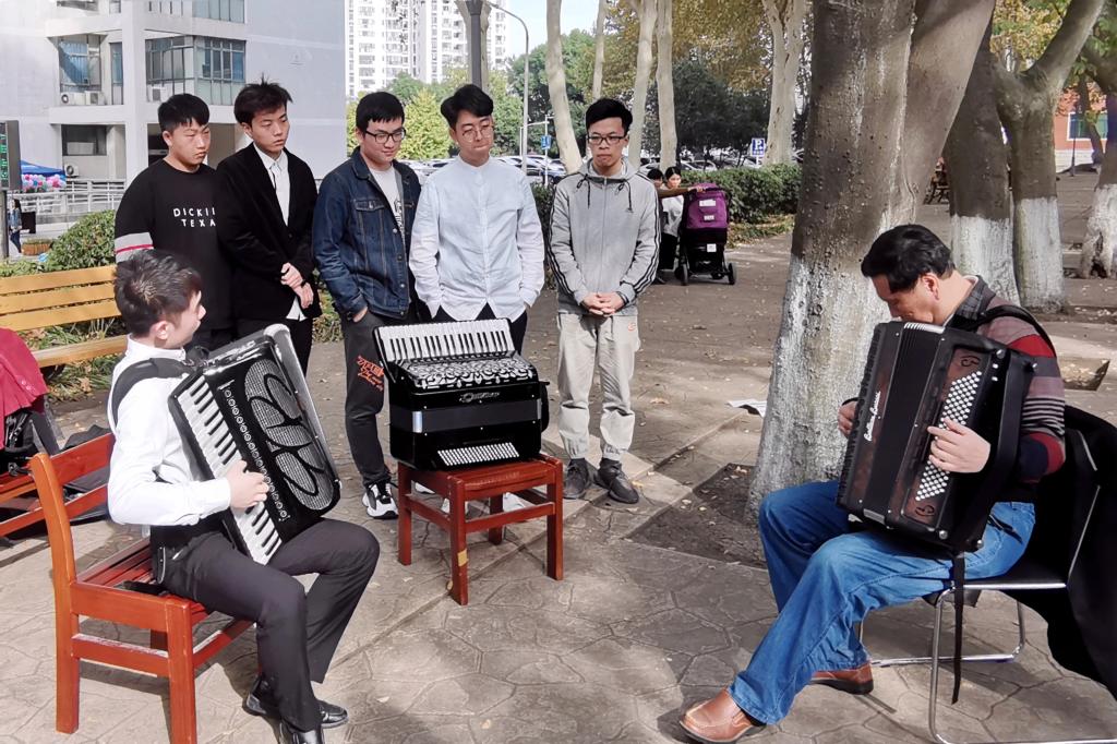 乐器科普展接近尾声,数学与统计学院的博士生导师李工宝教授挎着自己的手风琴,与在场的四位手风琴专业的学生进行了一段关于手风琴乐器的交流。他不仅表达了自己对音乐和手风琴演奏的见解和感受,也与在场的学生连续演奏了数首乐曲。李教授认为乐器科普展利于同学们了解关于乐器的常识,增进对音乐的理解。并语重心长地感慨道,学习任何一项乐器都需要花费大量的时间。非专业学生可以发展业余爱好,利用学习的空余时间弹奏乐器,可以感受音乐的美妙。对专业的学生来说,自身的专业更要精益求精,才能获得更大的进步。
