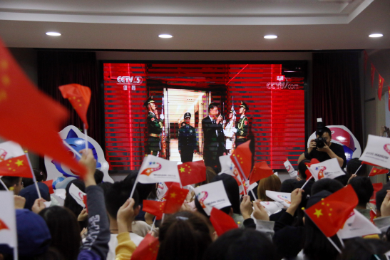 巨幅五星红旗、真人版《清明上河图》、从丝绸之路的阵阵驼铃声到通向未来的复兴号,无一不吸引着同学们的视线,观看直播的各位同学随着场内观众不时高声齐唱“五星红旗,你是我的骄傲”并不断挥舞手中的国旗为运动员们加油。