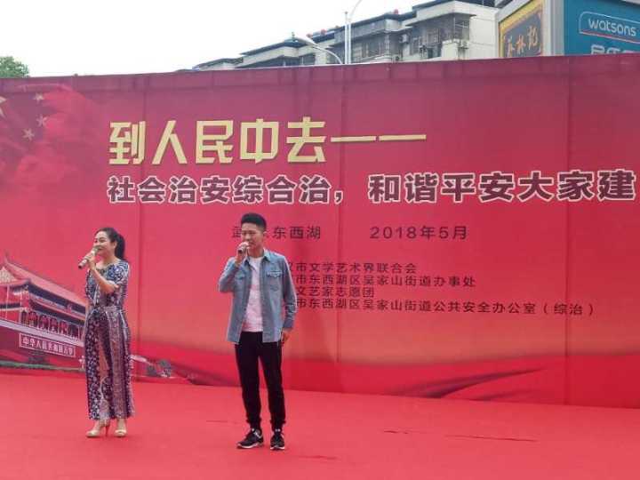 为深入学习贯彻习近平新时代中国特色社会主义思想和党的十九大精神,坚持“以人民为中心”的工作向导,大力弘扬“乌兰牧骑”精神,5月10号这天,武汉文艺家志愿团组织40多位文艺志愿者走进东西湖区吴家山街海林广场开展“到人民中去——社会治安综合治和谐平安大家建”文艺志愿服务活动。来自华师音乐学院的04级校友陈吟和14级本科生耿瑞颂共同演绎了由陈朝汉教授作曲的男女声二重唱《武汉你早》,歌曲旋律活泼,展现了大武汉的动人魅力,受到观众们和东西湖区吴家山街各领导的一致好评。通过文艺演出、民间艺术展示展演等民众喜闻乐见的形式,满足人民群众日益增长的精神文化需求,促进社区和谐发展。