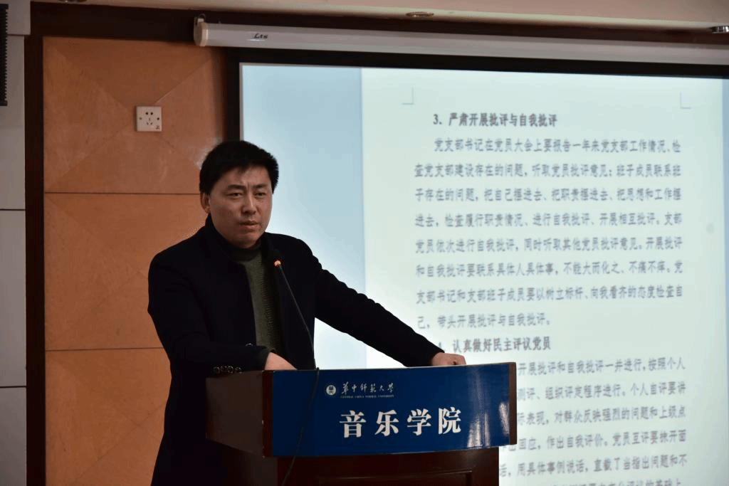孙永祥书记在会议开始前报告了2017年音乐学院党支部工作情况、党支部建设存在的问题,并认真听取了其他教师党员的批评意见。孙永祥书记强调,本次民主评工作,要深入贯彻党的十九大精神,牢固树立“四个意识”,坚定“四个自信”,提升基层党组织组织力,查找纠正“四风”突出问题。并且,要坚持问题导向,紧密联系实际,发扬党内民主,规范工作程序,引导党员严肃认真参加党的组织生活,进一步发挥基层党组织战斗堡垒作用和党员先锋模范作用。