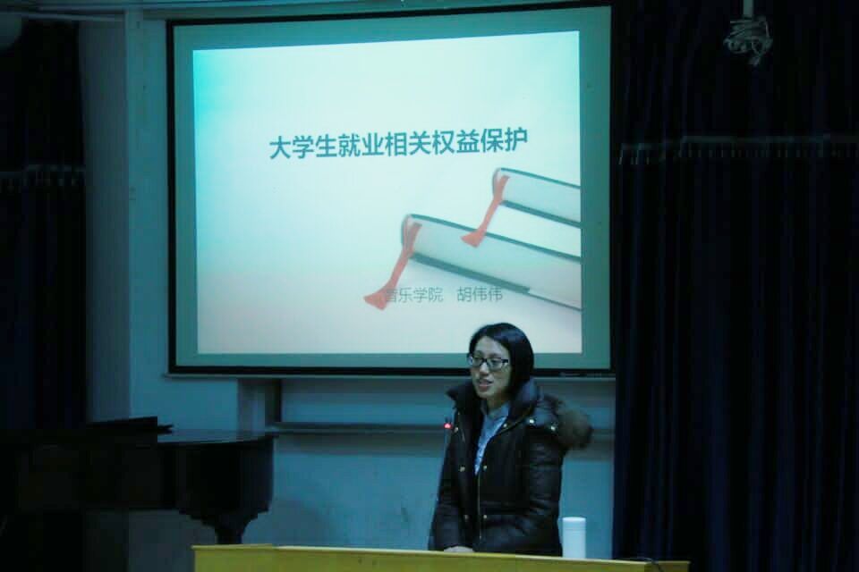 (通讯员:胡艺璇)为了增强大学生的法律意识,提高大学生在就业问题中对自己权利的保护意识,2017年12月25日晚六点,音乐学院邀请到了学院党务干事,16级辅导员胡伟伟老师在音乐学院427教室开展了大学生就业相关权益保护的讲座,本次讲座由音乐学院17级学生孙震林主持。同学们皆认真聆听和记录。