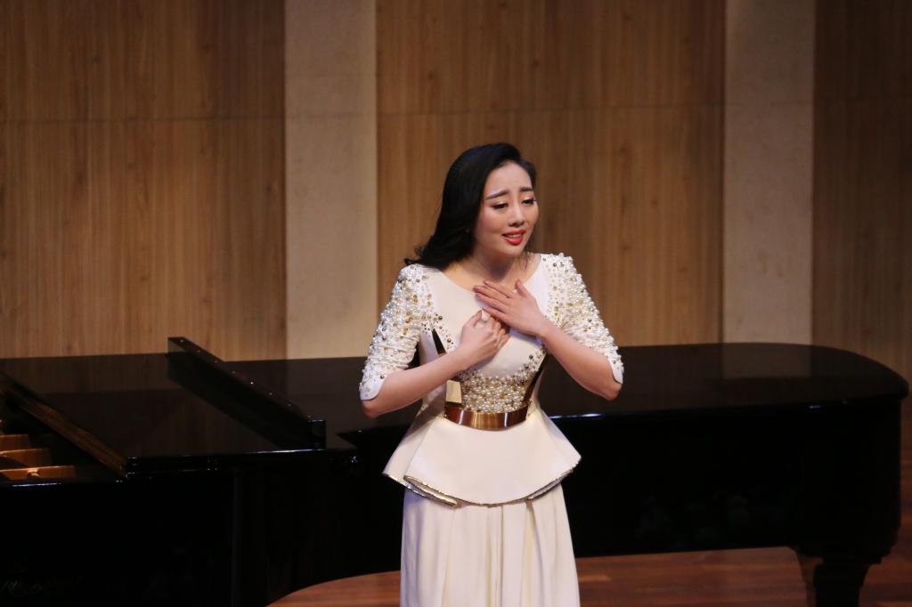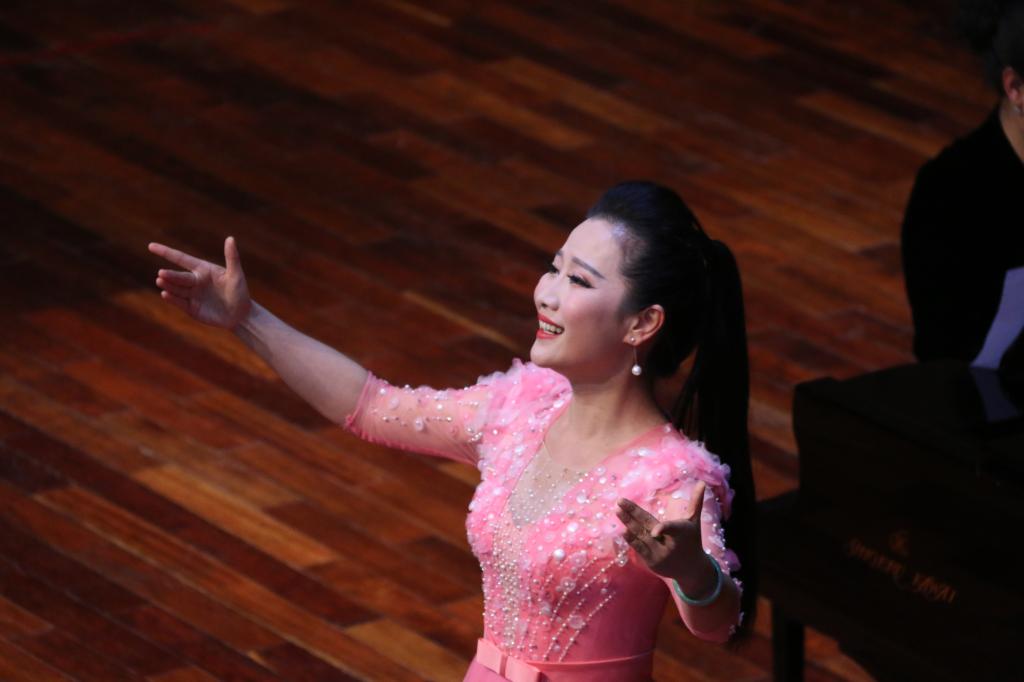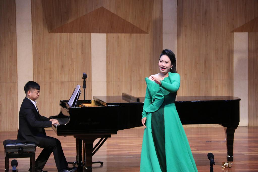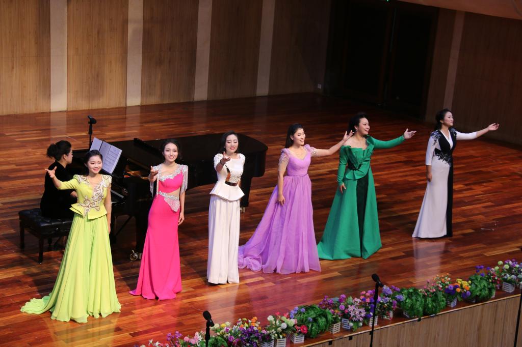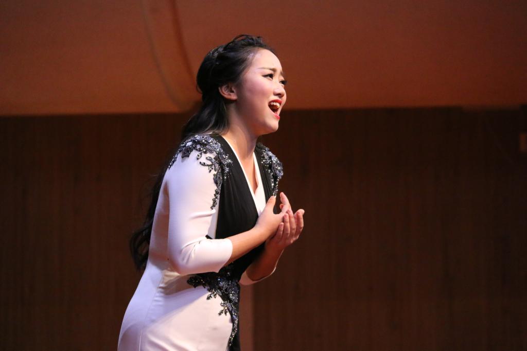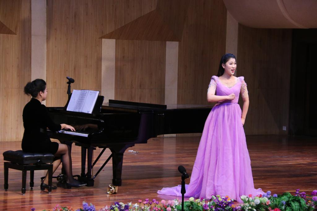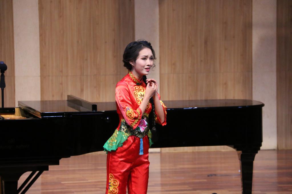 由全体学生们带来的江苏民歌《茉莉花》拉开了晚会序幕。学生们身着不同色彩的礼服,以齐唱和轮唱的方式,共同对歌曲进行了完美的演绎。谢依琳和黄丽分别为我们带来《请茶歌》与新疆民歌《嘎俄丽泰》,展现了她们良好的舞台表现能力,使观众们全情投入于她们曼妙的歌声中;紧接着是由柯璐带来的云南民歌《小河淌水》和由李思洁带来的陕北榆林小曲《五哥放羊》。两人身着民族服饰,歌声中配合一定的舞蹈动作,引领大家进入到到浓烈的民族风情之中;许博文所演唱的《红豆曲》以中国四大名著之一《红楼梦》为背景,其歌声中充满相思情感,诉说着缠绵悱恻的爱情故事。