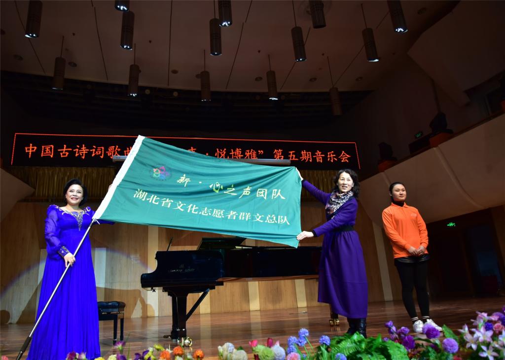 音乐会开始前,湖北省老年艺术大学校长王桂枝向华中师范大学音乐学院代表周燕老师授予“新·心之声团队湖北省文化志愿者总队”旗帜,以示对华中师范大学志愿工作的支持和认可。