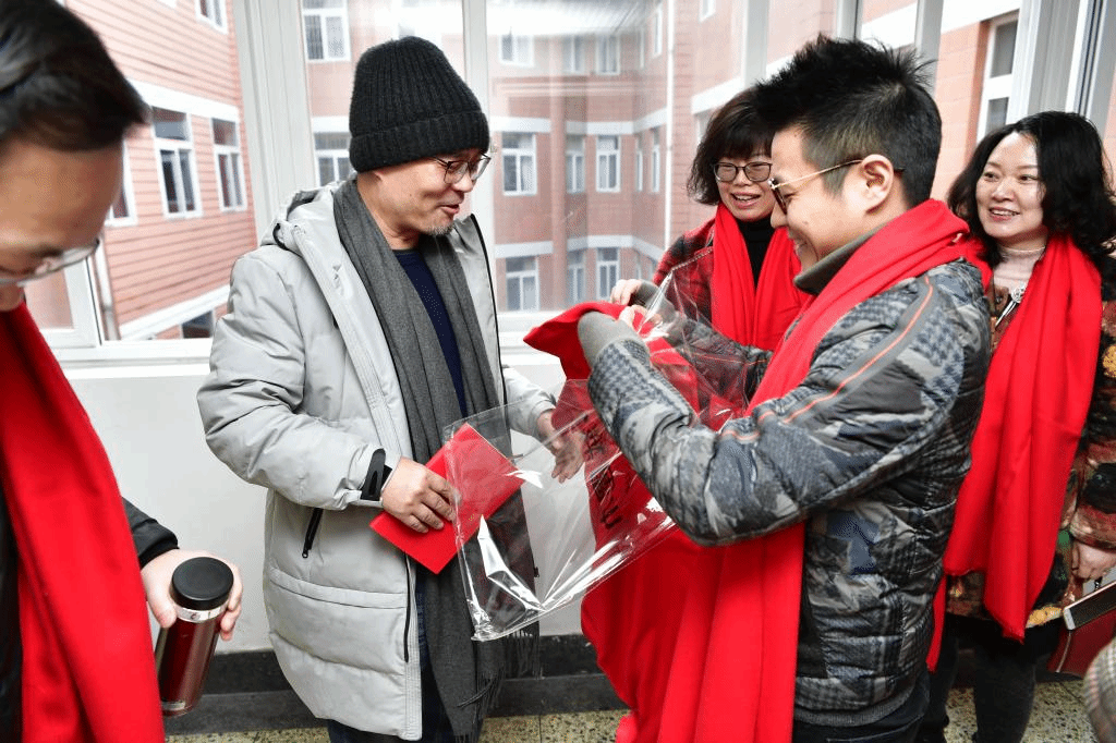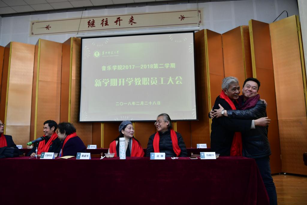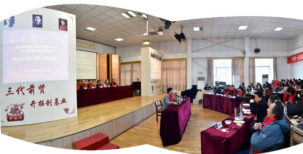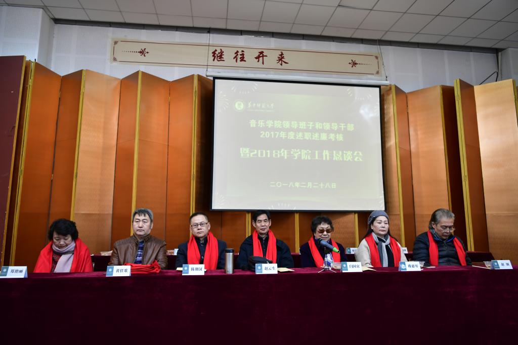 2018年2月28日上午,音乐学院727演播厅温馨上演“新学期开学教职员工2018年工作恳谈会暨学院领导班子和领导干部2017年度述职述廉考核大会”。音乐学院全体在职教职工和退休教师代表参加了本次会议。在入口处,青年教师为每一位老师戴上红围巾,送上热气腾腾的汤圆和一份神秘礼物。走进会场,“三代前贤开拓创基业,四方英才复兴谱华章”,横批为“继往开来”的对联格外醒目。主席台上退休教师,主席台下在职教师,还有院学生会主席和院团委副书记作为学生代表被邀请参加大会,大家围坐成半圆型会场,其乐融融。会议由音乐学院党委书记孙永祥主持。