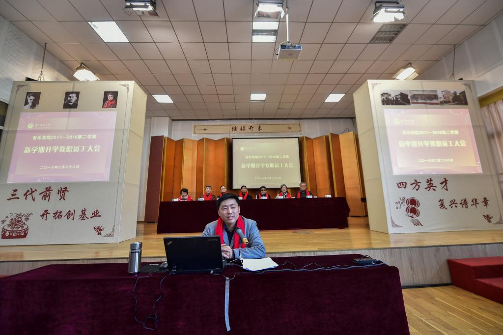 吴凡副院长在讲话中扼要回顾了学院2017年工作取得的主要成绩及个人在教学、科研工作中的情况,对2018年度工作做出总体构思:从内部管理到过程管理再到细节管理的双向流动基础上,推进与完善规范化教学管理,构建与发展特色型教学团队。最后吴凡院长鼓励大家为音乐学院的十三五愿景和美好的明天贡献力量。