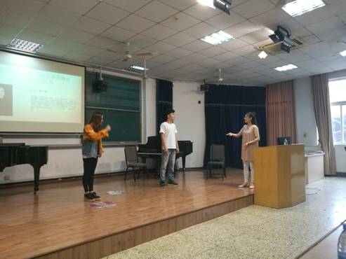 在讲述了相关的理论知识之后,黄老师通过游戏,请同学们上台与之互动,帮助同学们解放自己的天性,消除同学们上台紧张的心理,并帮助同学们在表演前松弛肌体,排除私心杂念。