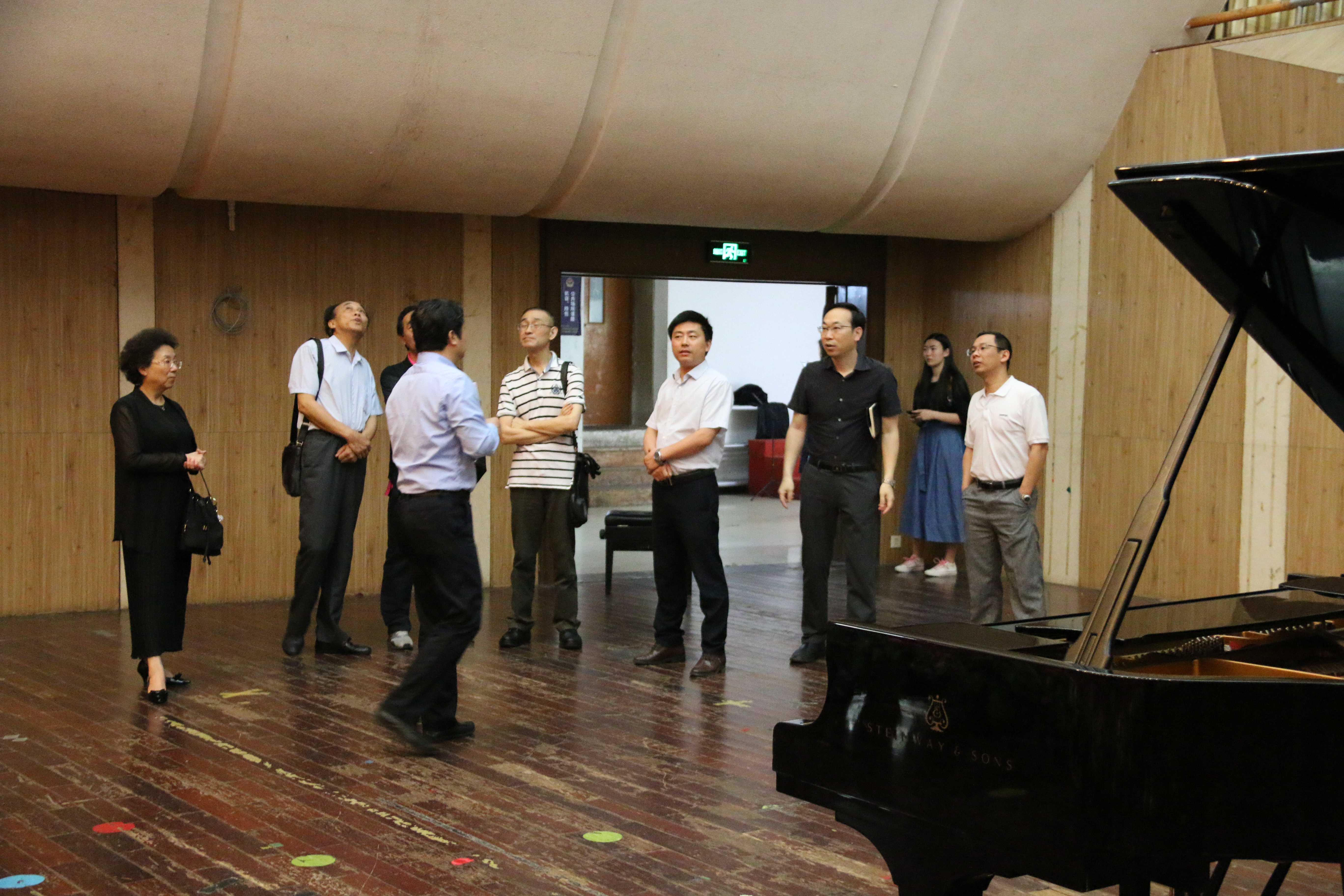 首先学院领导带领专家一行参观检查了音乐厅、实验示范中心等场所,重点查看了二楼数码钢琴室、音乐创作室及一楼虚拟仿真实验室等。