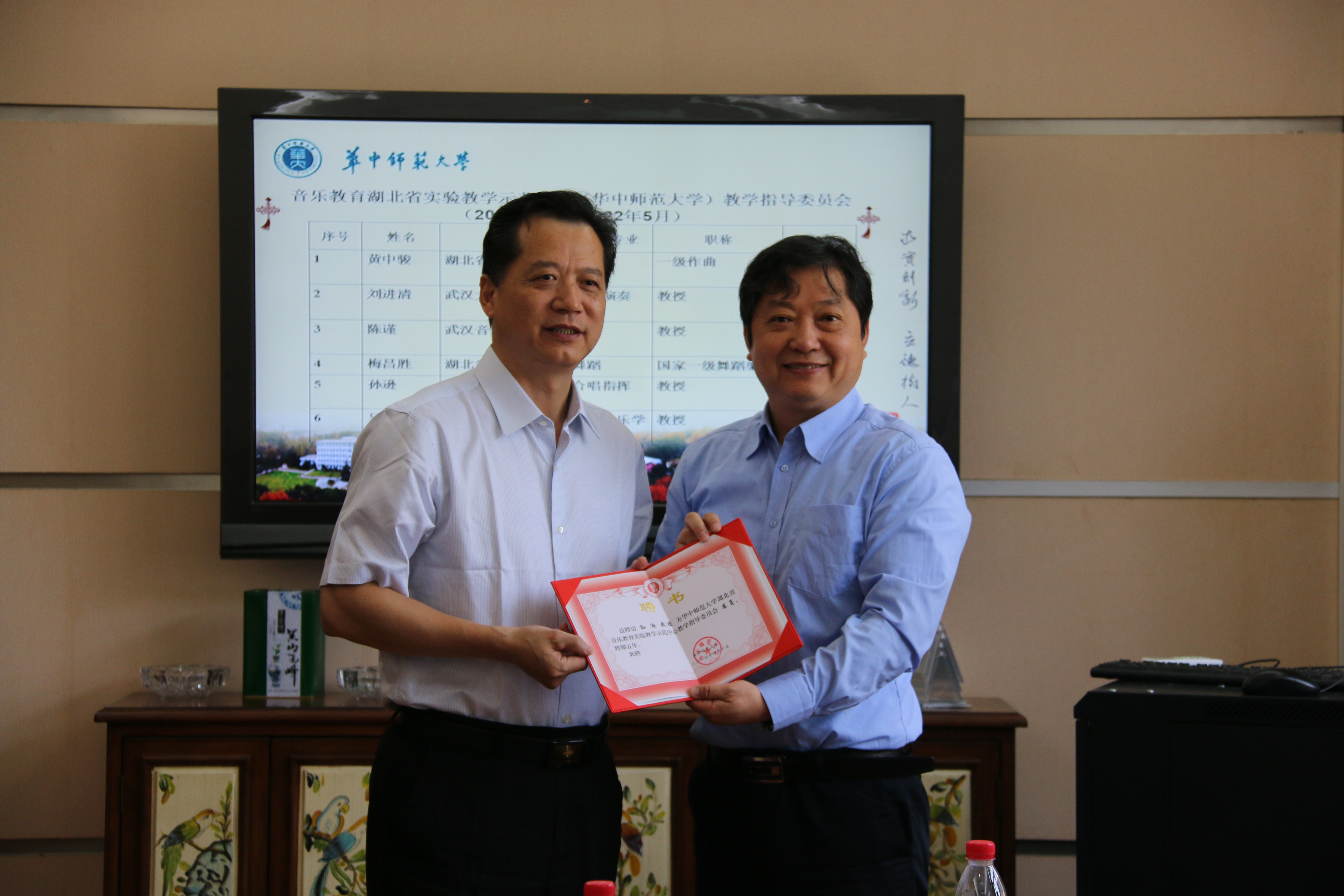 会议分两个阶段进行,第一阶段由孙逊院长主持会议,首先邀请华中师范大学副校长彭南生致辞。彭校长简要介绍了学校办学历史,特别指出历史悠久的华中师范大学一直将人才培养放在核心位置,科研是一定要为教学服务的,在人才培养的过程中实习、实践、实验又是不可或缺的环节,所以学校非常重视实验室的建设。他说:音乐是人类最美的语言,近些年来音乐学院的的发展不仅有利于院内的学科、专业建设,还有利于提升华师学子的艺术素养,因此自2009年教育部批准建设实验教学示范中心以来,学校、教育部和省教育厅一直大力支持。他表示在各级领导的关心支持下,中心全体人员的共同努力之下,此教育中心的建成极大的促进了学生的学习和音乐学院的科研,促进了教师的教学和表演实践,推进了人才的培养。还表示在未来不仅要纵向的比较正视现实再迎头展翅进行超越,还要注重横向比较要把实验中心放到全国乃至于全世界去比较。会议第二项,由彭南生副校长宣读了成立教学指导委员会的决定,并一一为教学指导委员委员颁发了聘书。并同与会师生合影留念。